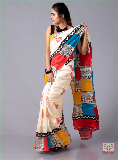 White Block Printed Silk Mark Certified Bishnupuri Silk Sarees