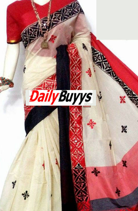 White & Red Bangladeshi Pure Cotton Kathiawari Sarees