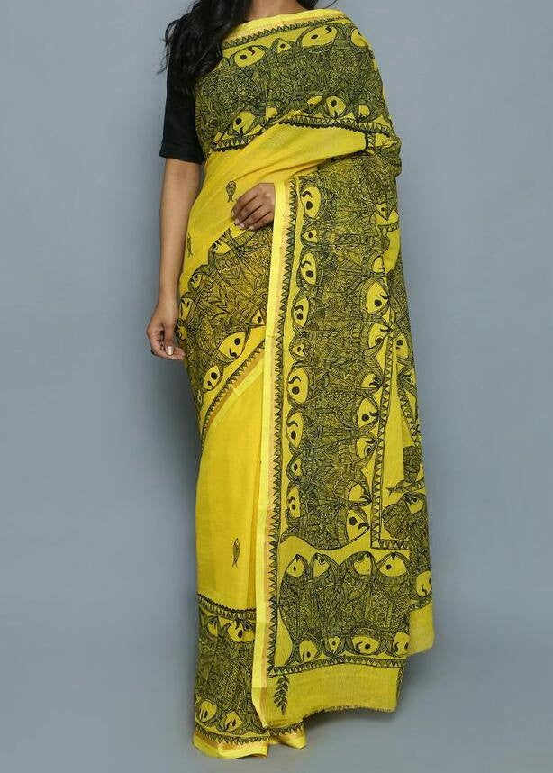 Yellow Pure Silk Mark Certified Tussar Silk Madhubani Sarees